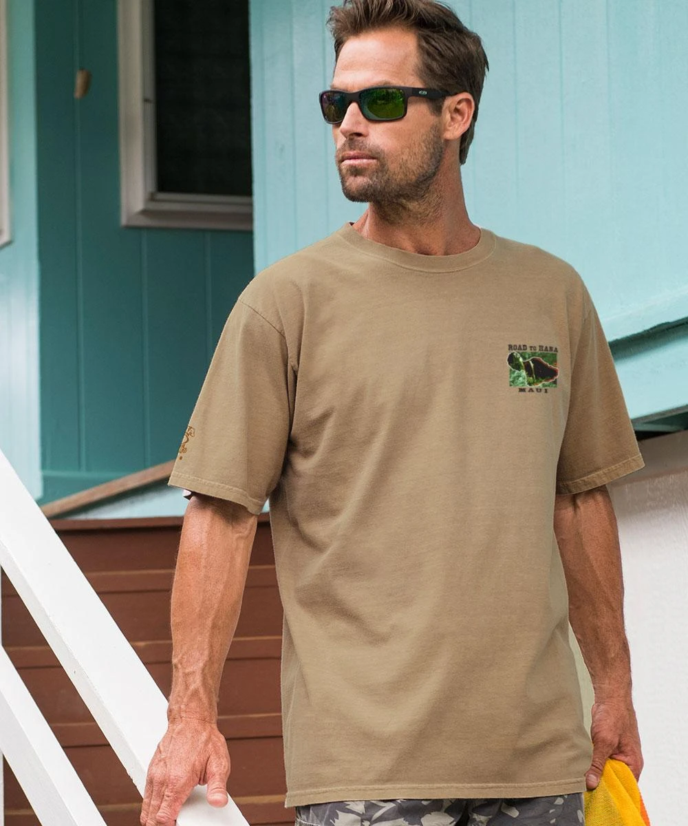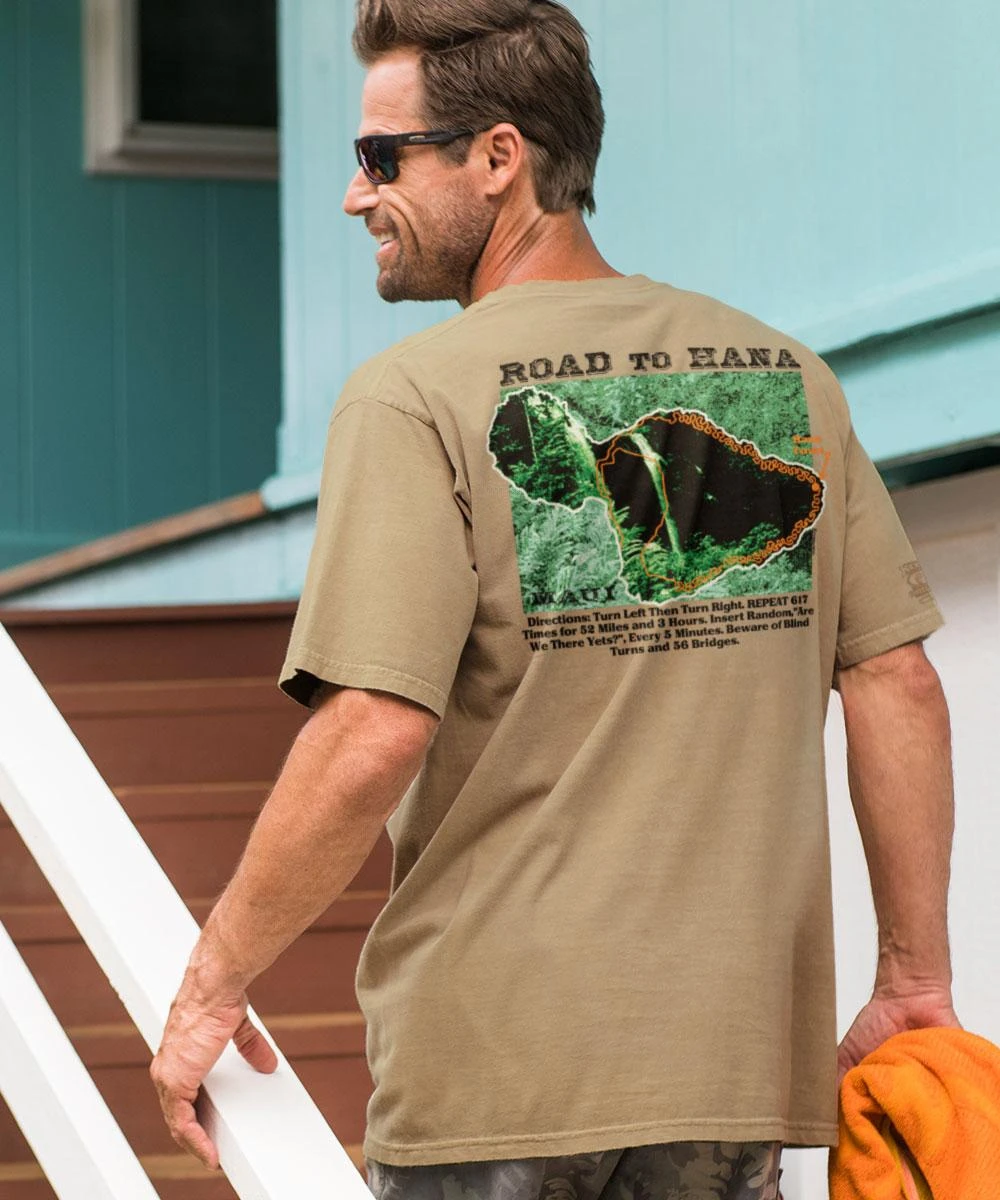 Full of amazing scenery like cliffs, beaches, waterfalls and splendid rainforests, driving the winding road to Hana is a must for anyone visiting Hawaii. And also a must is this short-sleeve T, perfect for celebrating your adventure or as the catalyst to get you to some day experience this one-of-a-kind road. Made using our exclusive specialty Kona coffee dying process and featuring 100% combed ring-spun cotton, this t-shirt has 50+ SPF protection to keep you feeling cool, calm and protected all year long. We only use environmentally friendly water-based inks that penetrate the material’s fiber resulting in more vibrant colors, softer feel and artwork that doesn’t crack or peel. Plus, it is proudly printed in the United States for quality you can see and designs that stand the test of time.