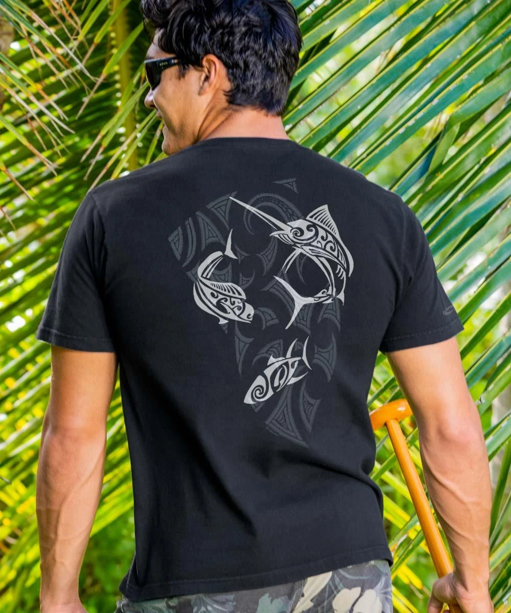 The gamefish that live in the waters surrounding Hawaii are some of the most powerful and dynamic animals in the sea. Using tribal-style artwork, our artists are able to capture their strength and energy that brings fishermen from all over the world to try to catch one. Made from 100% cotton that is ring-spun then combed to remove impurities, this fabric is luxuriously soft and lightweight yet incredibly strong. We only use environmentally friendly water-based inks that penetrate the material’s fiber resulting in more vibrant colors, softer feel and artwork that doesn’t crack or peel. Plus, it is proudly printed in the United States for quality you can see and designs that stand the test of time.
