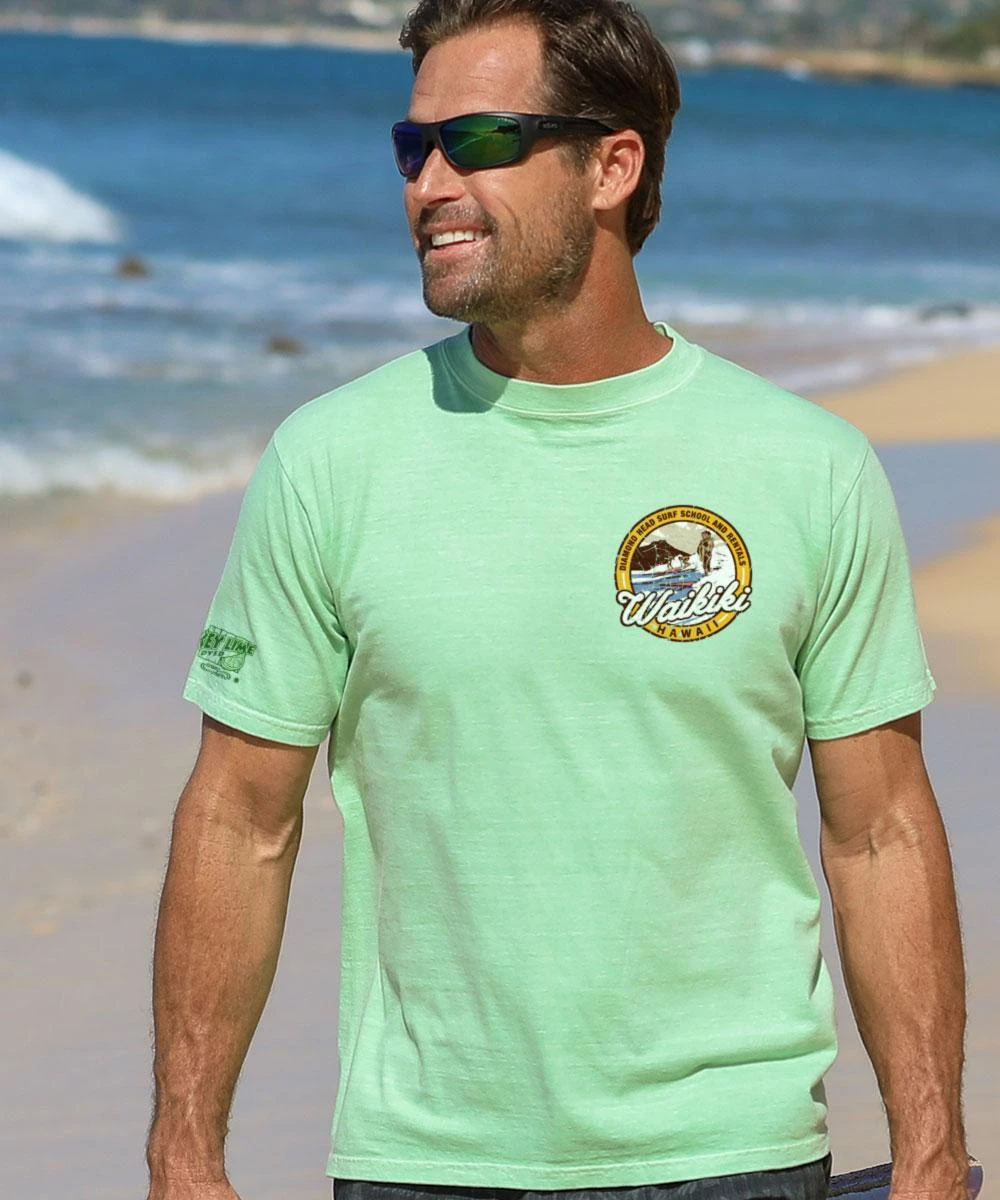 When it comes to surfing, Waikiki is where it all started with both royals and locals alike. Honor the good old days of long boards and uncrowded waves with this vintage style tee dyed with real key limes. Made using our exclusive specialty dyeing process that uses real key limes and featuring 100% combed ring-spun cotton. This t-shirt also has 50+ SPF protection to keep you feeling cool, calm and protected all year long. We only use environmentally friendly water-based inks that penetrate the material’s fiber resulting in more vibrant colors, softer feel and artwork that doesn’t crack or peel. Plus, it is proudly printed in the United States for quality you can see and designs that stand the test of time.